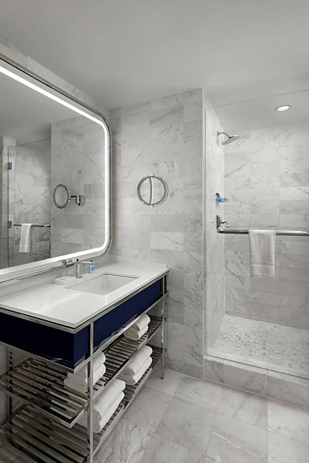 This room offers an extra large bed and spacious seating area equipped with a 32-inch LCD TV, iPod docking station and work desk. The marble bathroom features a bath or shower and includes a bathrobe and toiletries.